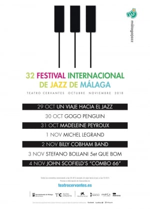 Den årlige jazzfestival vender tilbage til Málaga og ser ud til at være mere spændende end nogensinde, med begivenheder der finder sted over hele byen, ud over den officielle opstilling på Cervantes Theatre. Den erfarne franske musiker Michel Legrand, guitarist John Scofield, den amerikanske sanger Madeleine Peyroux, den legendariske trommeslager Billy Cobham og en af afsløringerne fra de seneste sæsoner, trioen fra Manchester, GoGo Penguin, sigter mod den 32. Malaga International Jazz Festival. Den italienske pianist Stefano Bollami fuldender det udenlandske program organiseret af Teatro Cervantes, som mellem den 29. oktober og 4. november vil bevæge sig fra jazzfusion til avantgarde-genren og samle legender fra fortiden sammen med en af de væsentlige kvindelige stemmer i øjeblikket. På mandag den 29. oktober vil CAMM indvie den 32. internationale jazzfestival i Malaga med en rejse til jazz, en rejse gennem 1900-tallets jazz via komponister som George Gershwin, Aaron Copland eller Dave Brubeck. Efter denne introduktion, informativ og rettet mod familiens publikum, vil dørene til Cervantes Theatre åbne tirsdag den 30. for udforskningen af grænserne for improviseret musik med GoGo Penguin, en trio dannet af Chris Illingworth på klaver, Nick Blacka på bas og Rob Turner på trommer. Mancunians producerer eksperimentel musik af højeste kvalitet og samtidig enormt tilgængelig for forskellige målgrupper. Inspireret af komponister som Debussy, Shostakovich eller den avantgarde John Cage, den uhåndterlige Brian Eno og indie-luminaries som Radiohead, forsøger de endda at begive sig ind på territoriet for elektronisk musik af Massive Attack eller Aphex Twin. GoGo Penguin udgiver på det prestigefyldte Blue Note, med hvem de har udgivet deres sidste to albummer, Man made object (2016) og A humdrum star (2018). Madeleine Peyroux vil optræde onsdag den 31. for at vise fortjenesterne ved Anthem, hendes nye album, understøttet af et band bestående af Graham Hawthorne (trommer og vokal), Paul Frazier (bas og vokal), Andy Ezrin (keyboard og vokal) og Aram Bajakian (guitar og vokal). Den amerikanske sanger, guitarist og komponist tager et filosofisk syn på den nuværende tilstand af verden men fuld af håb og optimisme, som er blevet produceret og skrevet sammen med hendes habituelle samarbejdspartner Larry Klein (Lizz Wright, Melody Gardot, Joni Mitchell, Herbie Hancock). Den 1. november demonstrerer Michel Legrand sin person af en atypisk, tvangsfuldendt og uhåndterlig musiker. Ud over at være en alsidig komponist af symfonisk musik, klassisk, 'chanson', opera, pop og især soundtracks (til omkring 200 film), med hvilken han har vundet 3 Oscars ud af 11 nomineringer, har Michel Legrand haft en omfattende karriere som forfatter, arrangør og tolker af jazz, genren hvor han har arbejdet med stjerner som Miles Davis, John Coltrane, Bill Evans, Lena Horne eller Ella Fitzgerald. Forfatteren til musikken i Les Paraplyerne i Cherbourg er 86 år gammel, og spiller med bassist Pierre Boussaguet og trommeslager Franço