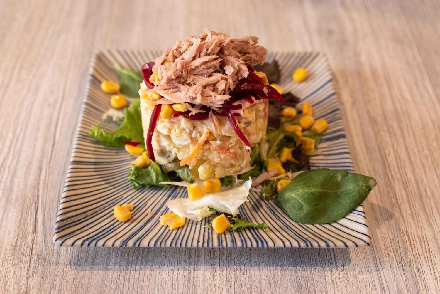 3) Wir gehen auch durch die engen und dekorierten Straßen von Malaga, bis wir das dritte Restaurant erreichen, in dem wir eines der speziellsten Gerichte unserer Gastronomie probieren können, das live zubereitet wird, zusammen mit köstlichen Auberginen mit Zuckerrohrhonig und einem weiteren Getränk.
