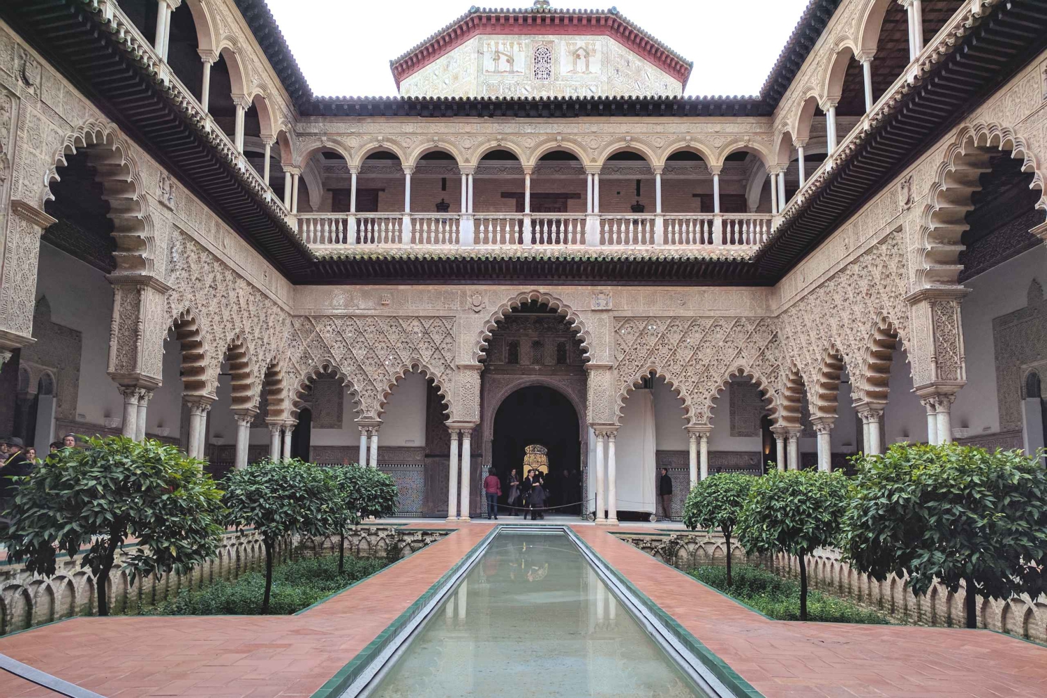 Once with the group you will make a short walk to the entrance of the Real Alcazar, strolling through streets surrounded by traditional facades and typical stores. Enjoy the side view of the Iglesia del Sagrario, the authentic Sevillian atmosphere and the impressive view of La Giralda as you reach the Plaza del Triunfo, where you and a local guide meet and will enter the Real Alcazar of Seville, one of the oldest palaces in use in Europe and declared a World Heritage Site by UNESCO.